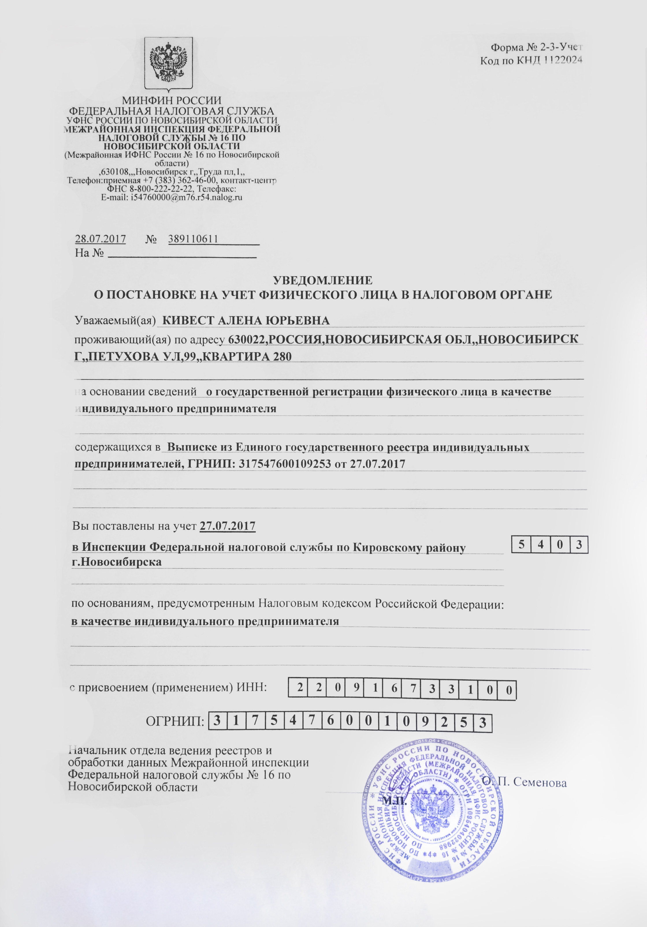 УВЕДОМЛЕНИЕ О ПОСТАНОВКЕ НА УЧЕТ В НАЛОГОВОМ ОРГАНЕ